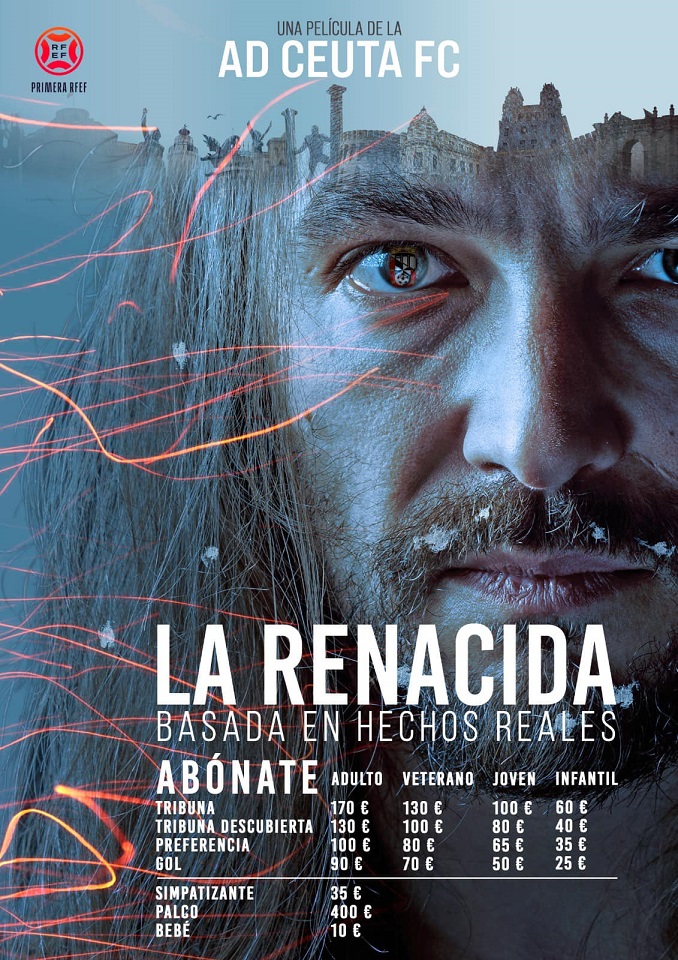 Como Alejandro Di Caprio en la película dirigida por Alejandro González Iñárritu en 2015. La AD Ceuta FC anuncia en su campaña de abonados ha renacido. ‘La renacida, basada en hecho reales’ es el lema que acompaña un cartel inspirado en el del mencionado film. El club ha explicado en sus redes sociales que vuelve con más fuerza que nunca en el nuevo escenario de la Primera RFEF y que la campaña de abonados quiere mostrar que “pese a los obstáculos y complicaciones en el camino, este club ha logrado llegar a esta categoría con esfuerzo, trabajo y el gran apoyo de la afición y de nuestra ciudad”.