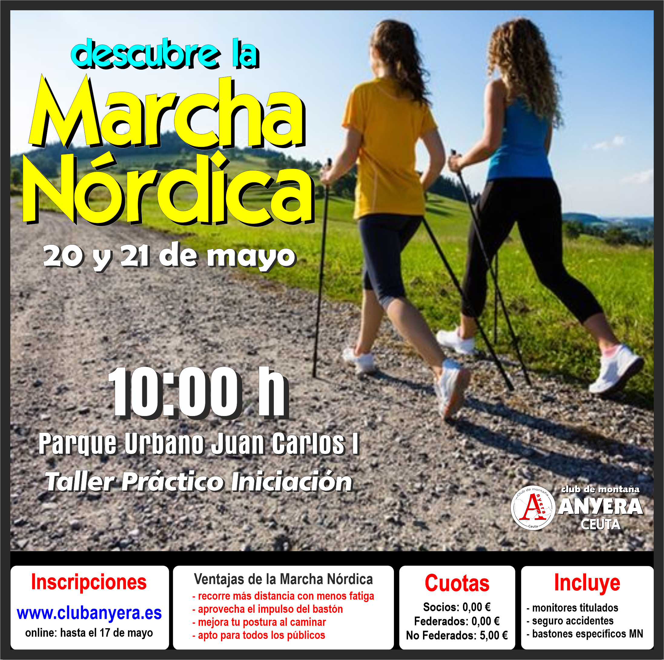 El Club de Montaña Anyera ha organizado los próximos días 20 y 21 de mayo, a las 10:00 horas, un nuevo Taller de Iniciación a la Marcha Nórdica, que se desarrollará en las inmediaciones de las instalaciones del club, en el Parque Urbano Juan Carlos I, en los bajos de la Marina. La actividad será eminentemente práctica y tiene como objetivo fundamental acercar a los ciudadanos a este nuevo deporte que consiste en caminar con unos bastones específicos que permiten mejorar el rendimiento deportivo, reducir la fatiga muscular y activar casi el 90 por ciento de la musculatura corporal mientras realizamos el sano ejercicio de caminar.