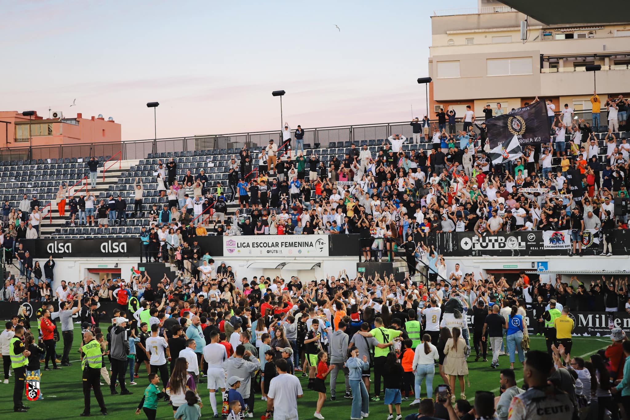 La Grada de Animación no ha cesado de alentar a su equipo y ha contagiado sus cánticos al resto de los graderíos. También ha ayudado mucho el guion que ha seguido el encuentro, con un Ceuta muy superior desde el arranque y que, además, se ha puesto muy pronto por delante en el marcador. El tempranero gol también en la segunda parte ha hecho vivir un desenlace bastante plácido y la euforia ha sido ya total con los dos últimos tantos y el giro que han dado los resultados del Recre y el Murcia.