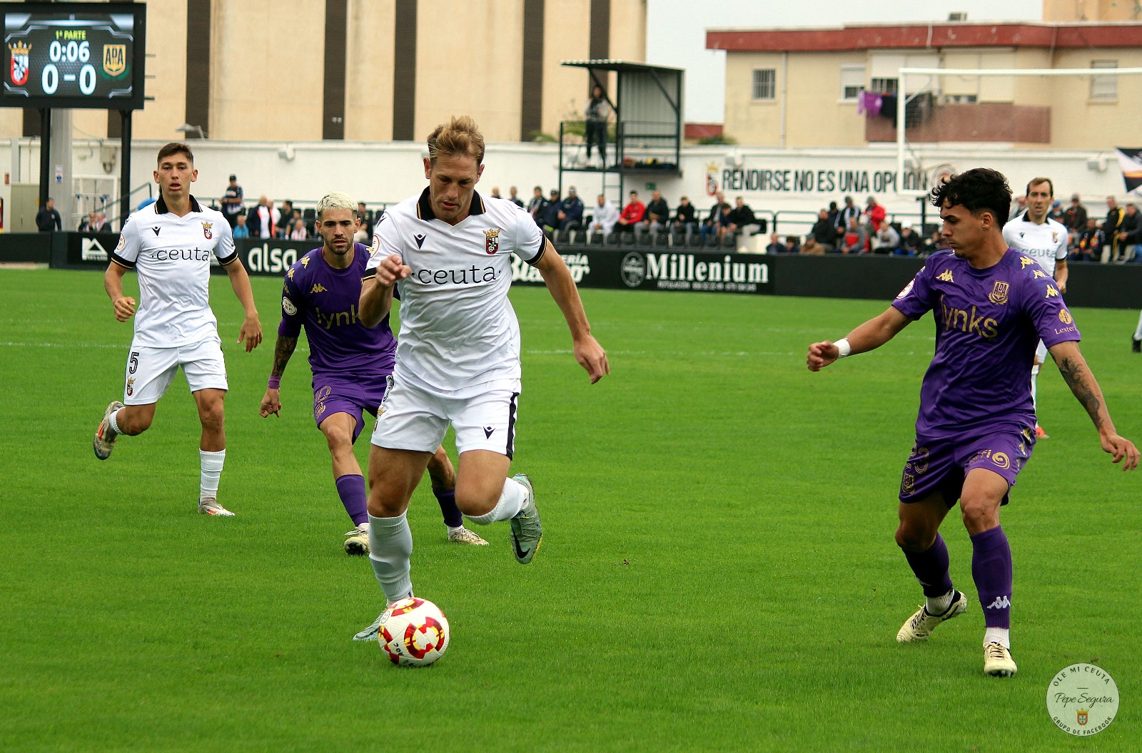 Pese a estar con uno menos, el Ceuta ha seguido teniendo el balón y volcado en ataque, pero el gol no llegaba. Ni siquiera en una falta lateral cabeceada por Aquino solo a las manos del portero.