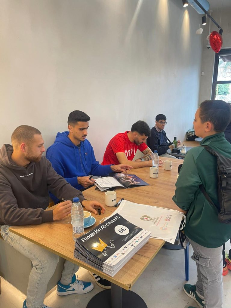 Los jugadores del primer equipo de la AD Ceuta FC Youness, Diego González y Capa han participado este miércoles por la tarde en un encuentro en una cafetería de la ciudad donde han firmado los calendarios solidarios de la Fundación AD Ceuta, compartiendo un momento cercano con aficionados y asistentes.